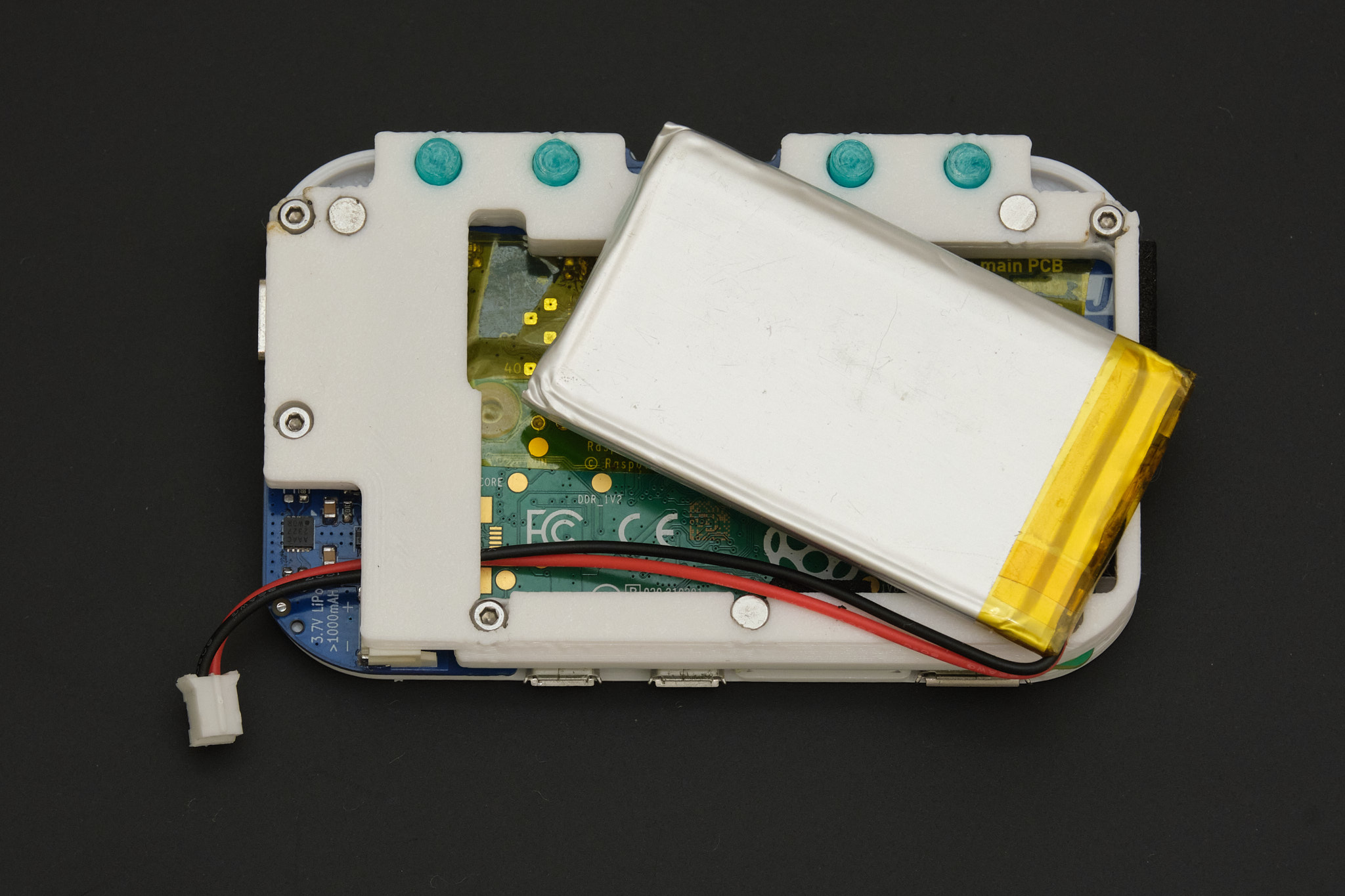 Apply two 6x10mm pieces and one 18x10mm piece of EPDM foam tape in the locations highlighted in blue below to cushion the battery and keep the assembly centered inside the mint tin. Connect the battery to the main PCB, insert it into the battery compartment, and tuck the wires in place along the side of the battery.